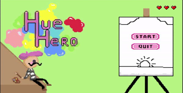 "Hue Hero" is a 2D pixel game about colors. It was made during a game jam with the theme of color. You play as a painter that has to bring back color to the world around him. To do so he has to collect paint cans and avoid the evil color erasers.